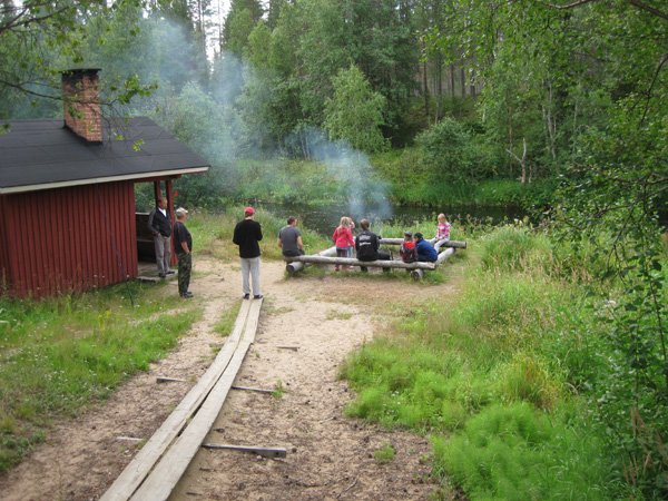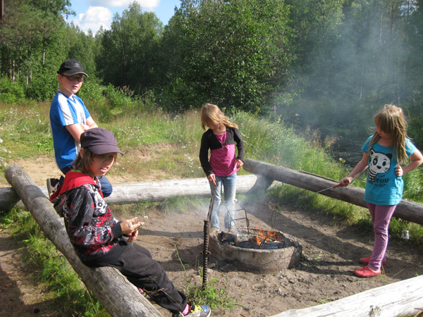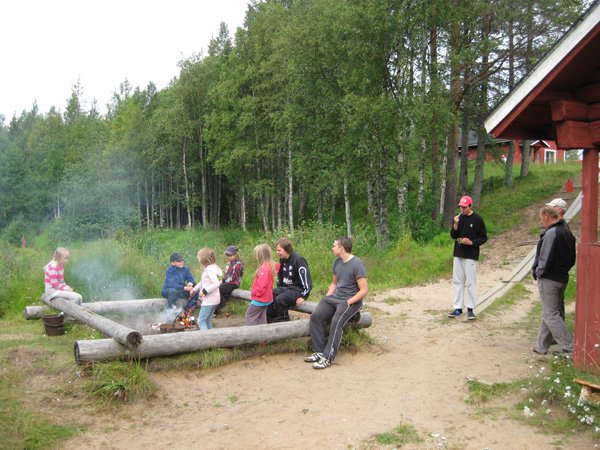 Kalastuksen ja makkaranpaiston lomassa on mukava kauniina kesäpäivänä vain istuskella nuotiolla ja välillä vaikkapa "kohentaa" nuotiota.