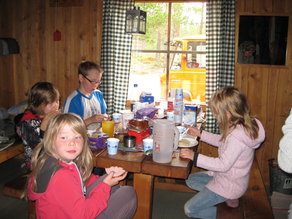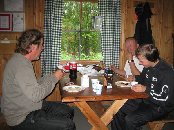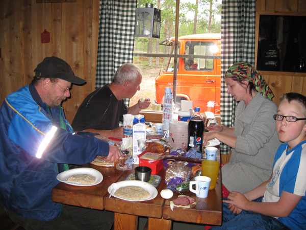 Kalastajat aamupalalla. Ruokailu oli perinteisesti reissun "suola". Tästä ei kukaan halunnut jäädä paitsi.